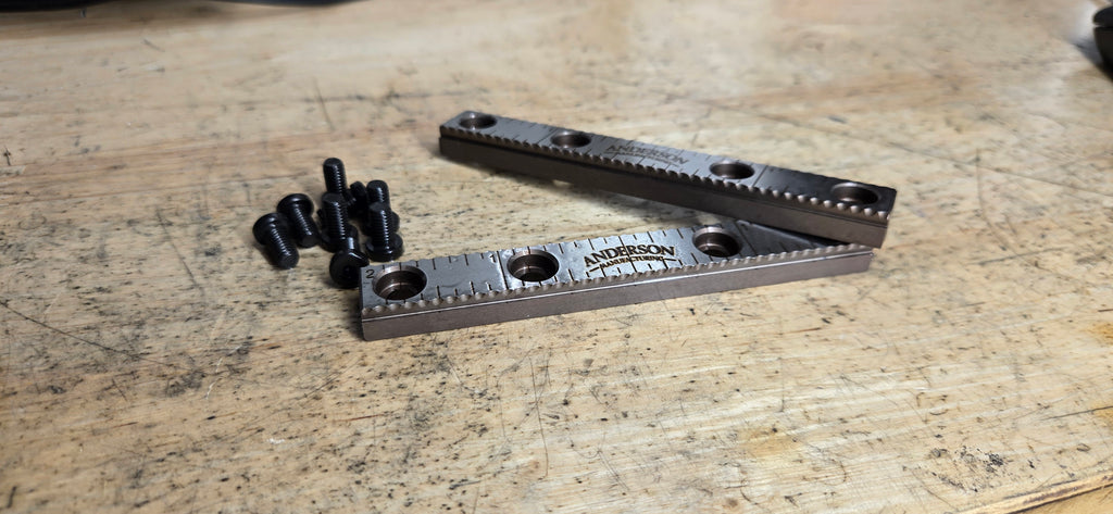 The Serra Jaws are a one stop shop for all your roughing operation needs. They are made from ground A2 tool steel then hardened in a vacuum furnace to 58-60 RC. These jaws are designed to work in the Orange vise Delta vises. They have a scale on them for easy alignment of parts with out the need for stops or measuring from the end of your jaw. They have an increased step height of .120 to grip onto more of your part allowing you to rough out your part with a minimal amount material to remove in your second operation. Serra jaws can also be used in fixture plates, pallets, and endless other fixture applications.